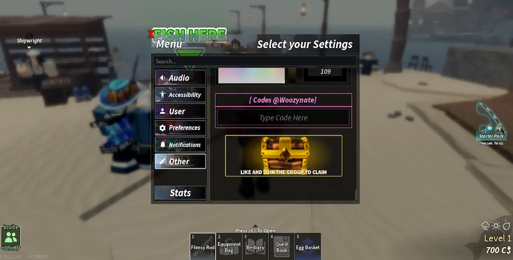 Redeeming codes in Fisch is slightly different from other Roblox games because the option is tucked away in the settings menu. Follow these steps: