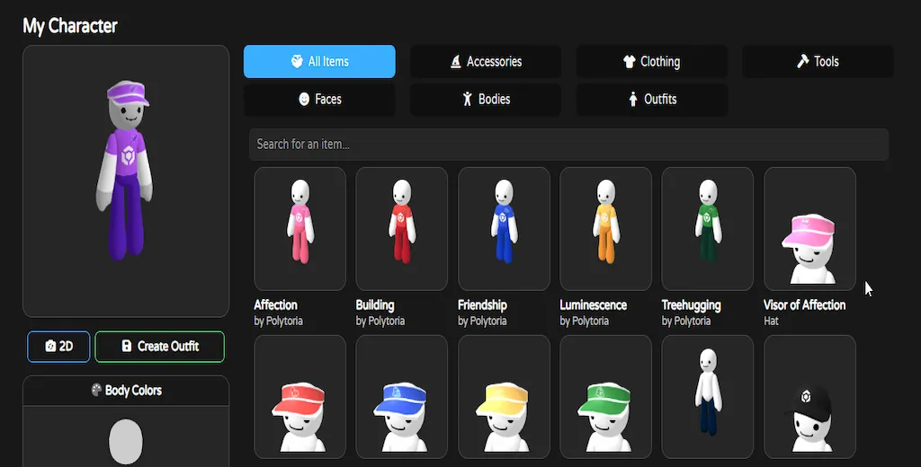 Ваш персонаж у Polytoria складається з блоків, що нагадує класичний стиль. У розділі Character ви можете безкоштовно змінити колір шкіри, вибрати базовий одяг або купити щось унікальне в магазині за Bricks.